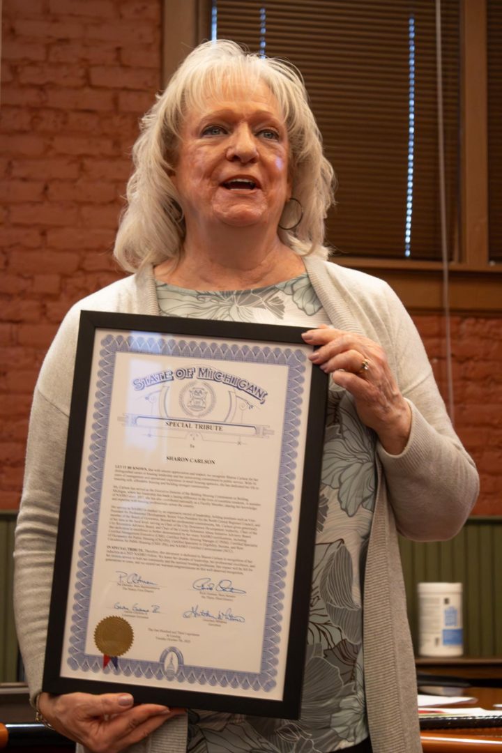 Belding City Councilors Linda Curtis and Bonita Steele encouraged Rep. Outman to recognize Director Carlson’s many years of service. Councilman Nikolai Zerkle, who also serves as Outman’s legislative aide, presented the tribute at a city council meeting.